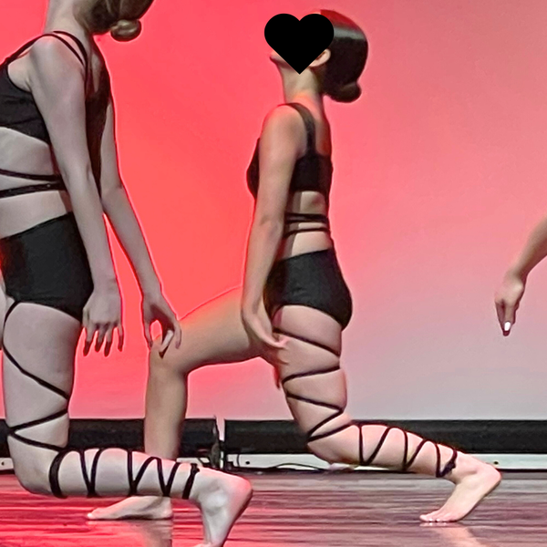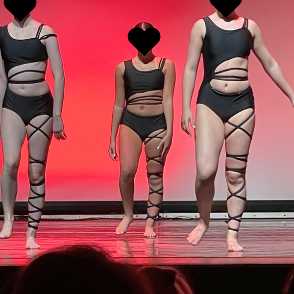 Custom made by On the Dance Floor, this sleek black one-piece costume features a high-waisted cut with bold mesh paneling and unique criss-cross elastic strapping across the torso and legs. The asymmetrical shoulder straps and open side detail create a strong, modern silhouette. Designed for movement, the fabric offers both stretch and structure. Ideal for contemporary, jazz, or open group routines.