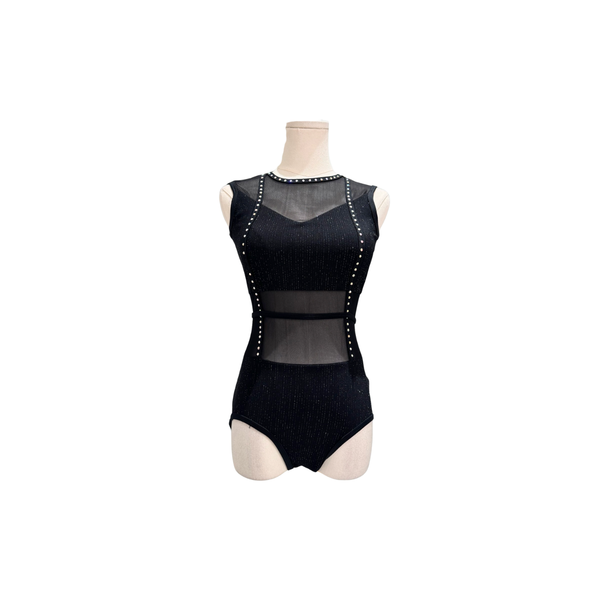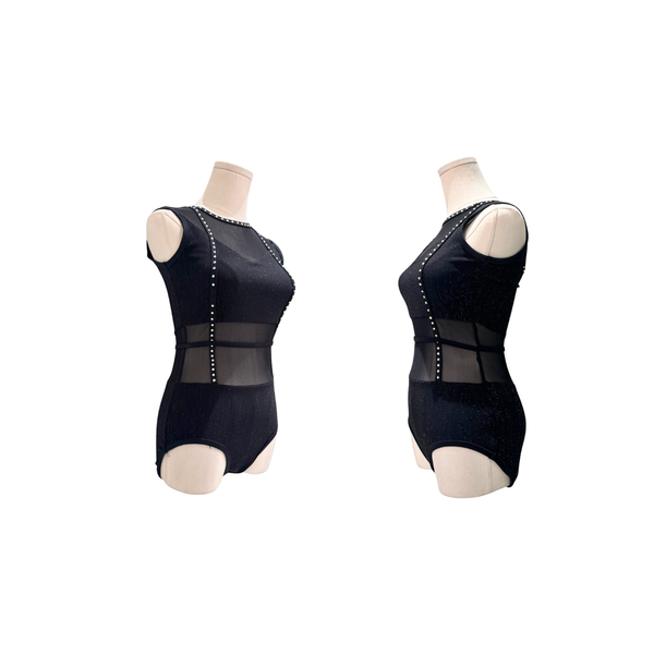 This sleek black bodysuit by On The Dance Floor features a sleeveless silhouette with subtle sparkle woven into the fabric for understated shine under stage lights. Sheer mesh paneling across the midriff and upper chest adds dimension while maintaining full coverage, with a keyhole back detail for added interest. Rhinestone trim along the seams provides just the right touch of embellishment. A versatile pick for contemporary, jazz, or lyrical numbers.