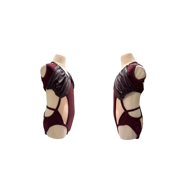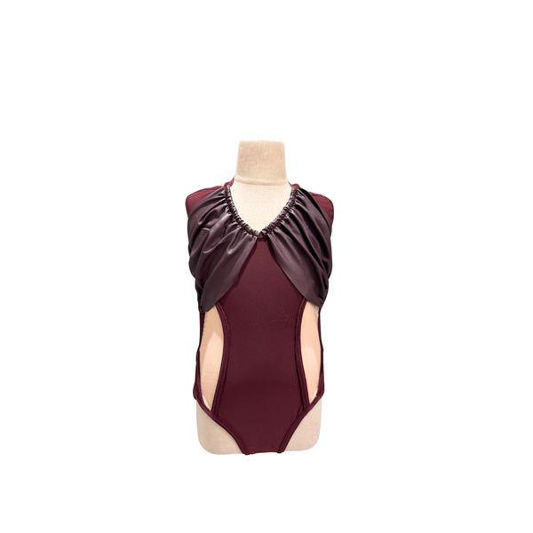 This one-piece dark purple bodysuit by Wesley Tang features gathered pleather detailing at the bust for a structured, draped effect. Beige mesh side cutouts and intricate back strap work create a bold silhouette from all angles. The rich colour and sleek finish make it a standout option for solos or contemporary group numbers. Ideal for dancers looking for a refined, high-impact look.