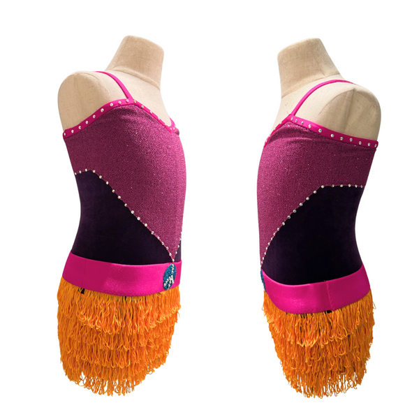 Custom made pink and purple velvet dress with orange fringe skirt and belt with rhinestoned peace sign.