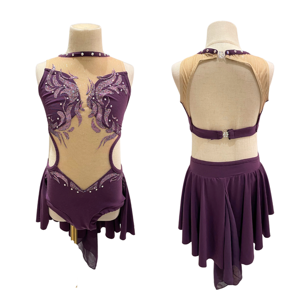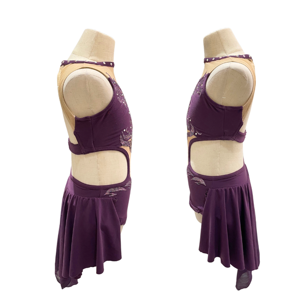 This sleeveless plum bodysuit features a beige mesh panel through the front, creating a cutout effect at the waist. The bodice is decorated with symmetrical appliqué and rhinestone detailing on both sides of the chest and at the hips. A short, sheer skirt is attached at the back for added coverage and movement. The neckline includes rhinestone accents.