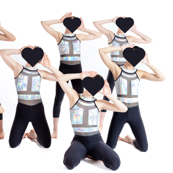 Custom made by Effie Mathews, this sleek and modern unitard features an iridescent silver holographic bodice with mesh paneling and solid dark grey trim. The halter-style neckline is paired with an open racerback design, while full-length dark grey pants create a clean silhouette. The stretch mesh waistband and shoulder cutouts add contrast and breathability. This costume is ideal for contemporary, jazz, or acro routines looking for a clean, futuristic aesthetic.