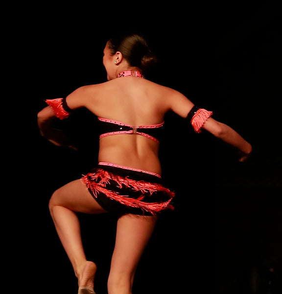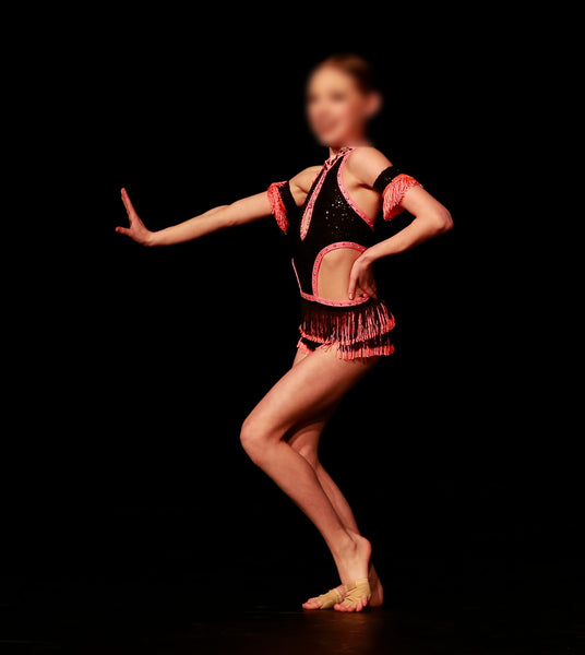 Custom made, beautiful coral and black sequinned one piece bodysuit with side cutouts, rhinestones and fringe. Comes with fringed arm cuffs.