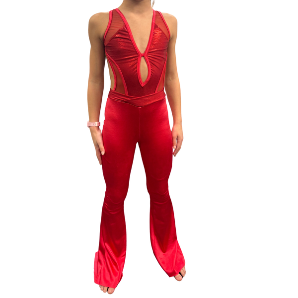 This vibrant red jumpsuit, designed by Wesley Tang, is crafted from a high-shine stretch fabric with sheer mesh cutouts, a teardrop front keyhole, and sleek open-back detail. A wide waistband and flared legs create a bold silhouette that moves beautifully on stage. Ideal for jazz, musical theatre, or high-energy numbers that call for a modern twist on retro glam.