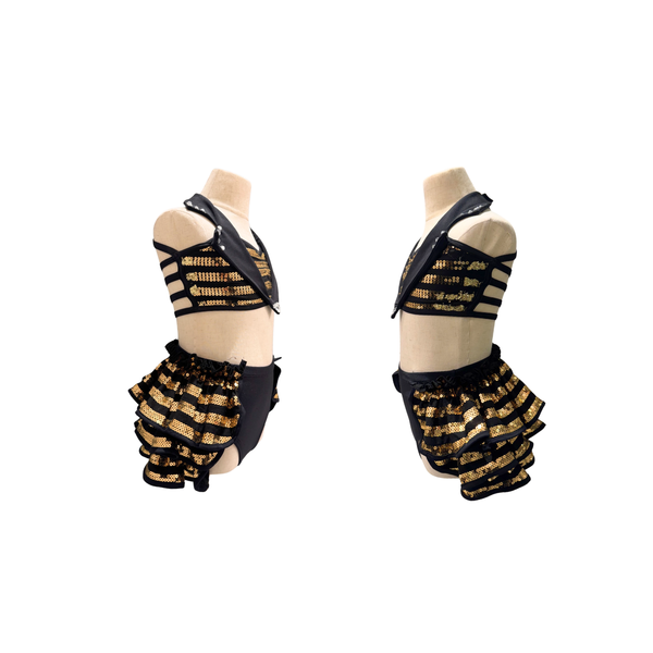 Custom made, black & gold striped sequinned bra top and matching briefs with half-skirt. Bee inspired.
