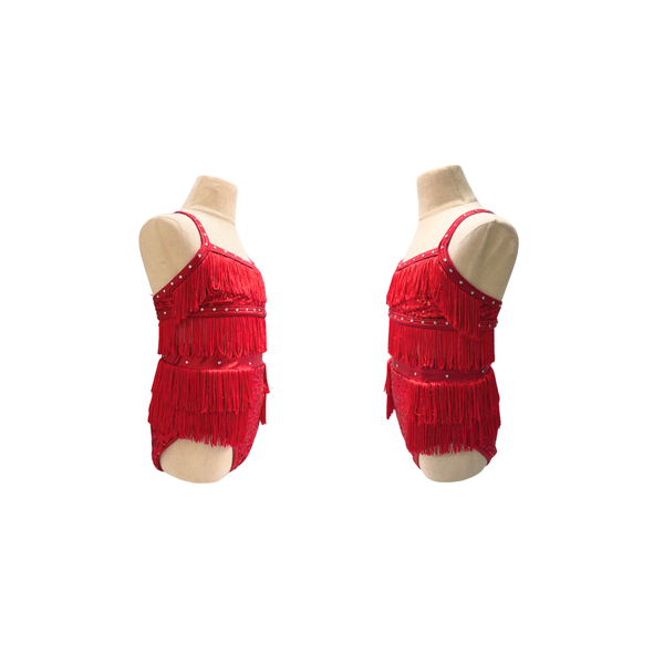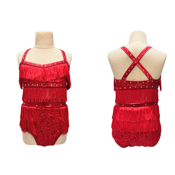 Super cute jazz solo costume! Red sequinned bra top and shorts with fringe and rhinestones. Costume originally from Weissmans.