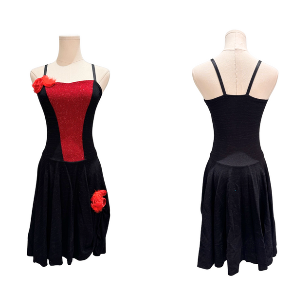 Custom made costume: Beautiful sparkly black and red dress that flows out when you twirl. Flower detail on the strap and skirt. Quantities and approximate sizes available: ~ Child X-Large (1).