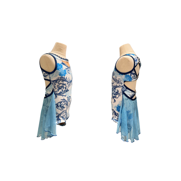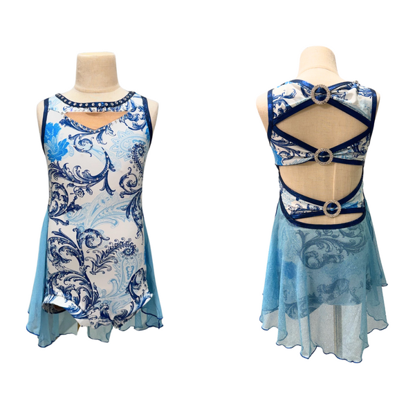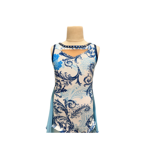 Custom made blue and white paisley bodysuit with blue sparkly flowy skirt attached at the back. Upper back also has beautiful detail where the fabric connects with rhinestoned clip.