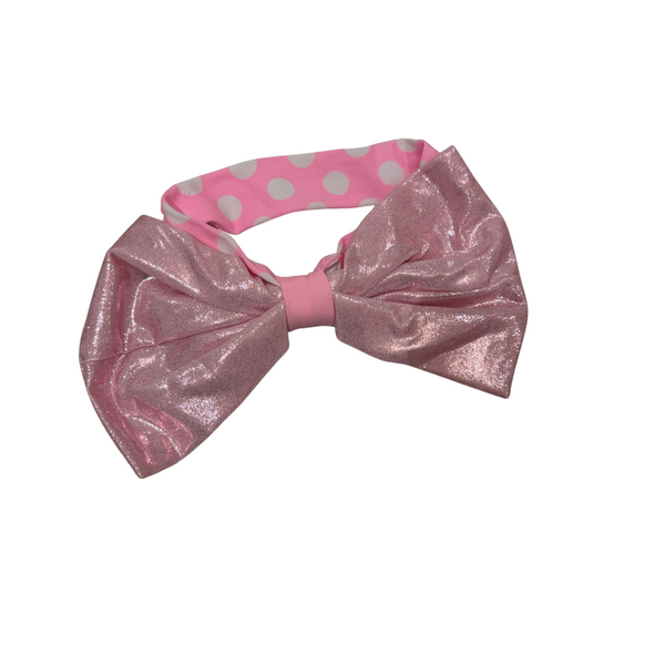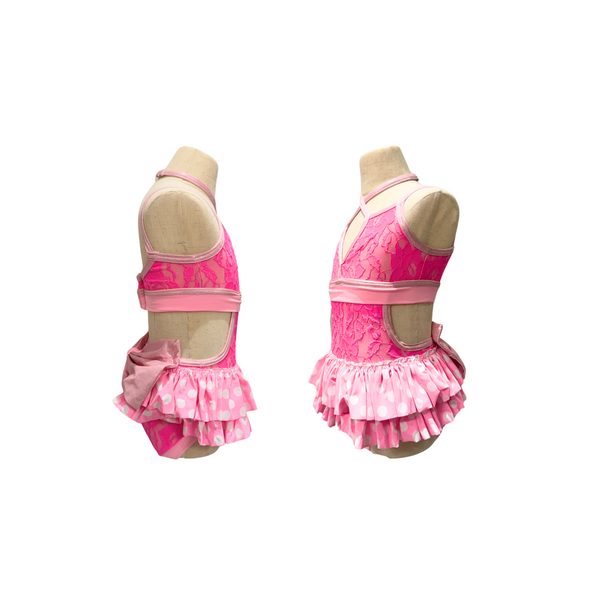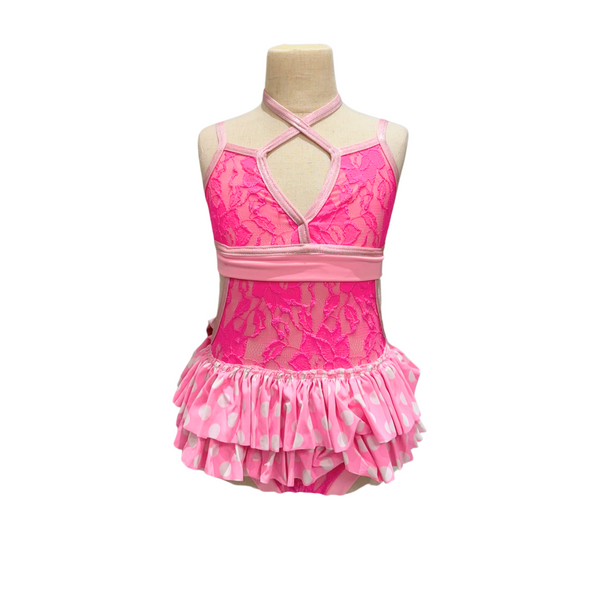 Custom costume by Wesley Tang Designs: Charming halter-style dance costume in bright pink lace with crisscross neckline, and layered white and pink polka dot ruffle skirt. Finished with a large shimmer pink bow on the back—perfect for mini jazz or tap performances. Comes with matching bow head band.