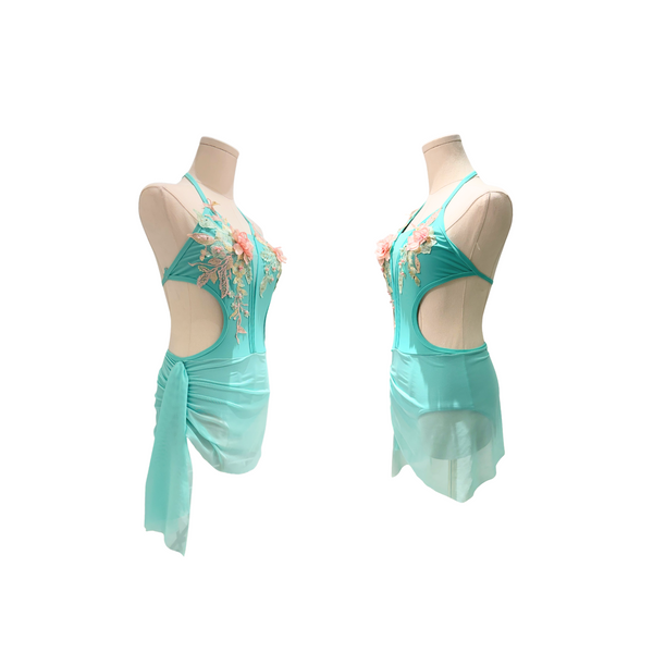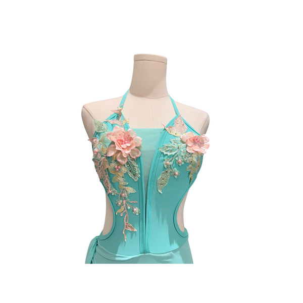 This custom On The Dance Floor aqua blue lyrical costume is a romantic standout, featuring dramatic side cutouts and a dreamy draped mesh skirt. The bodice is adorned with dimensional floral appliqué and pearls in soft pink and gold, adding a touch of elegance and texture. A halter neckline and open back complete the ethereal look, perfect for a delicate yet powerful performance.