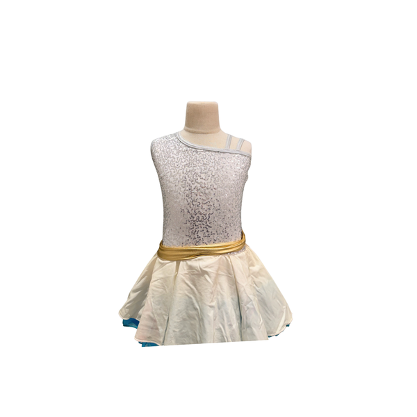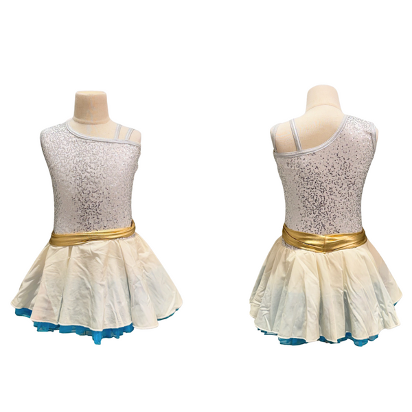 Custom made dress with silver sequinned top, a blue layered skirt with tule and a gold belt.