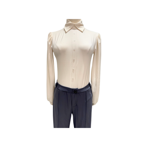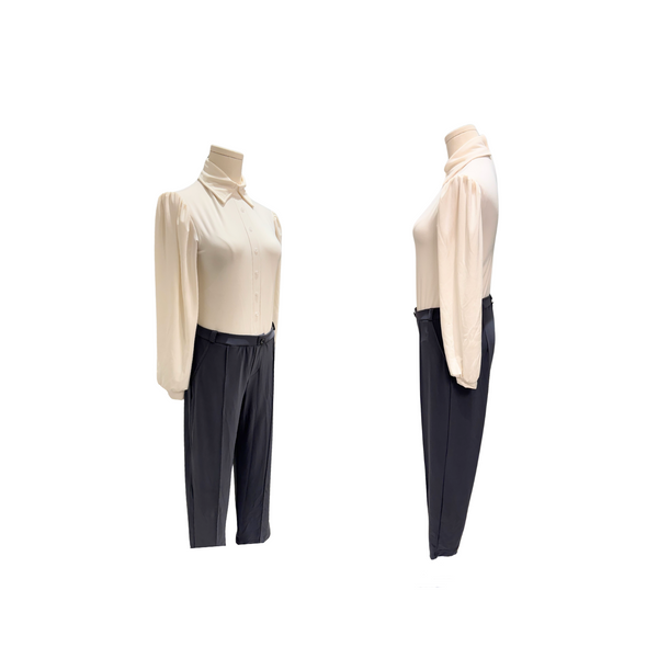 Custom costume by Wesley Tang Designs: Tailored one-piece jump suit dance costume designed to look like a crisp cream dress shirt paired with dark grey high-waisted trousers. Zip-up back closure. Features mock button-up front, collared neckline, and pleated pant detail—perfect for contemporary, character, or ballroom-inspired routines.