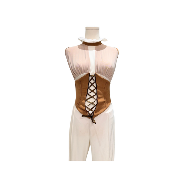 Custom costume by Wesley Tang Designs: Chic one-piece dance costume featuring a soft ivory mesh bodice, structured brown suede corset-style lace-up front, and white pants. Accented with a ruffled collar and open back—perfect for contemporary, acro character, or theatrical routines.