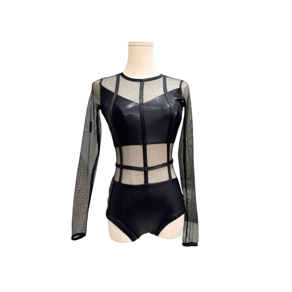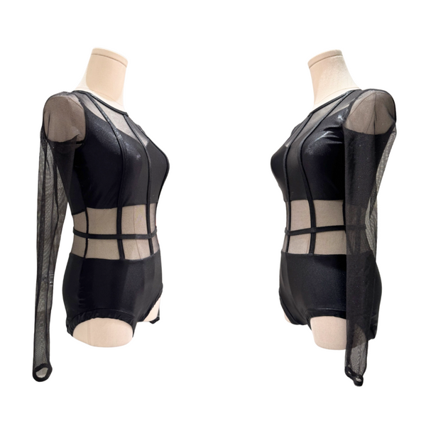 Custom costume by On the Dance Floor Boutique (OTDF): A modern classic—this black mesh long-sleeve bodysuit features sleek paneling, sheer cutouts, and a subtle shimmer finish. With its clean lines and contemporary silhouette, it’s ideal for contemporary, lyrical, or open category routines that call for bold simplicity and refined elegance.