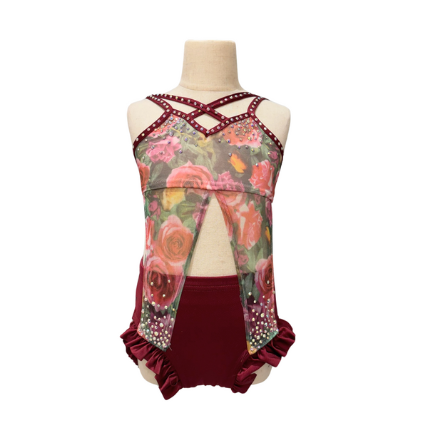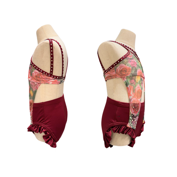 Custom made costume: Dark red/Maroon and floral mesh design bodysuit with strappy detail across the chest.Quantities and approximate sizes available: ~ Child Medium (1).Quality rating: 5/5 - In great worn condition, professionally cleaned.*Looking for additional quantities and/or sizes in this costume? Please email us and Reimagine will do our best to find them for you!*
