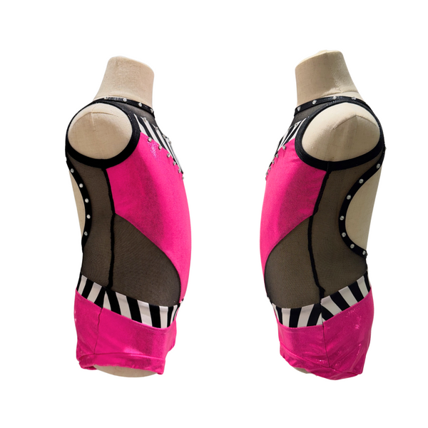 Custom made black and white striped and hot pink bodysuit. All rhinestones in tact, open back.Quantities and approximate sizes available: ~ Child Medium (1), ~ Child Large (1).
