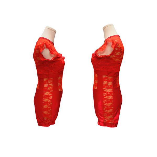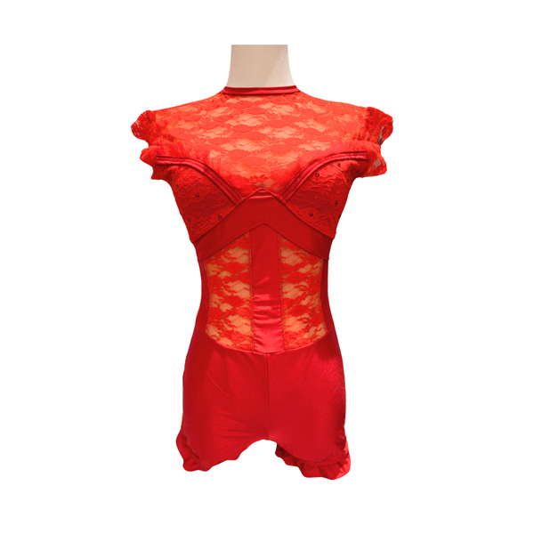 Custom costume: Red lace bodysuit with frill detail along the shoulders and bustier.Quantities and sizes available: ~ Adult Medium (1).Quality rating: 5/5 - In great condition, and professionally cleaned.*Looking for additional quantities and/or sizes in this costume? Please email us and Reimagine will do our best to find them for you!*
