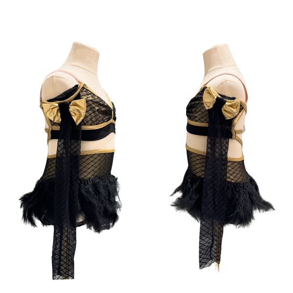 This striking one-piece costume, designed by Wesley Tang, features a black quilted mesh bodice with gold trim, off-shoulder sleeves, and layered feathered skirt for added texture and drama. Gold shoulder accents, crisscross back straps, and a metallic bow detail complete the bold stage-ready look. Perfect for jazz, contemporary, or themed routines needing a fierce, high-impact design.
