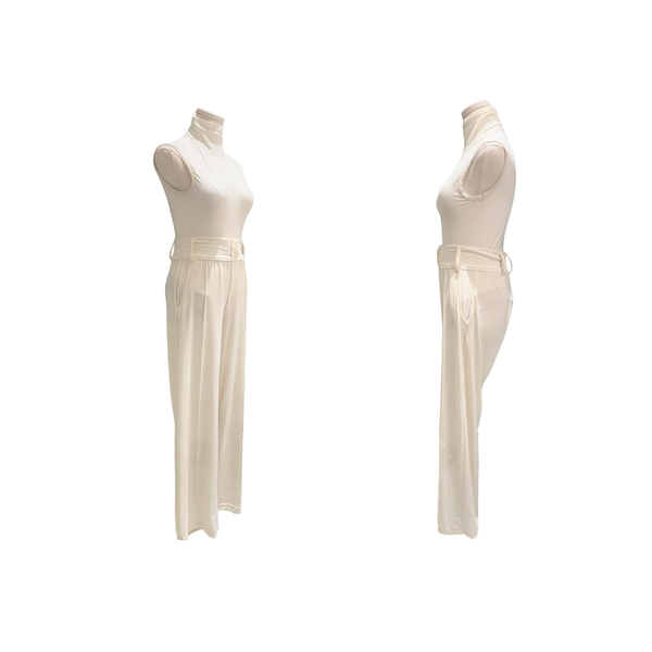 This sleek 2-piece set by Wesley Tang includes a high-neck, sleeveless bodysuit paired with matching wide-leg pants. The matte white fabric has a subtle sheen, and the waistband is finished with a satin-style belt and decorative button detail. The bodysuit offers a smooth, streamlined silhouette ideal for modern, jazz, or contemporary routines. Comfortable and minimal in design, this set provides clean lines and full mobility.