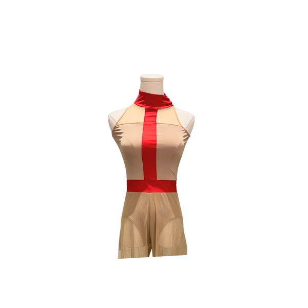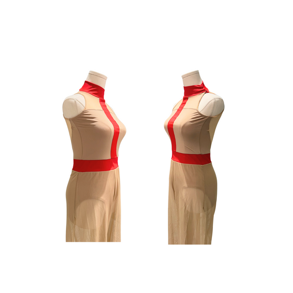 A clean and modern lyrical or contemporary look. This jumpsuit features a nude halter-style top with a bold red stripe running vertically from collar to waist, matched by a wide red waistband. The sheer mesh pant legs create soft movement while still showing the attached briefs underneath for full coverage. The open back and high neckline offer a streamlined silhouette. Suitable for dancers looking for a minimalist design with strong stage presence.