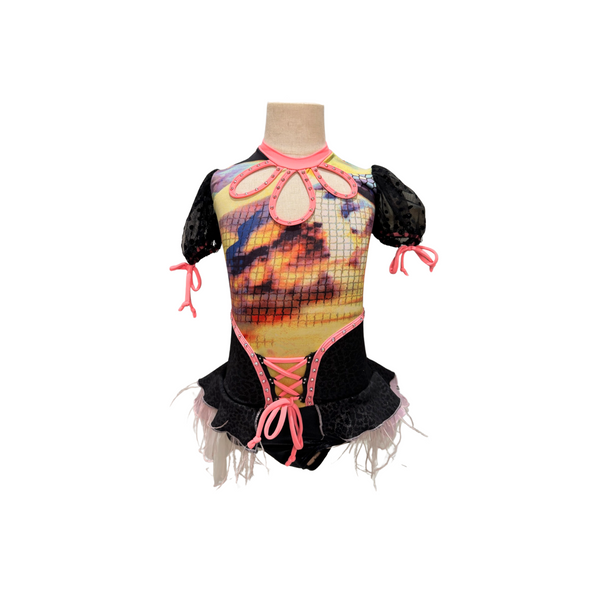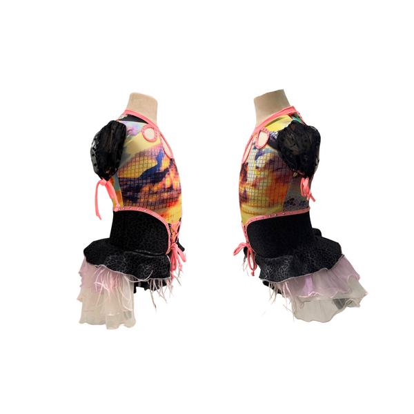 Custom made by Ashley Berry, this playful bodysuit-dress features a high-neck bodice with a printed overlay that combines warm tones of yellow, orange, and purple. Pink trim outlines the floral-inspired neckline, lace-up style front, and puff sleeves, while soft black panels with subtle leopard texture give the bodice structure. The attached skirt features a black peplum with layered lavender and white ruffled tulle for added volume. Open keyhole back and tie accents on the sleeves complete the look.