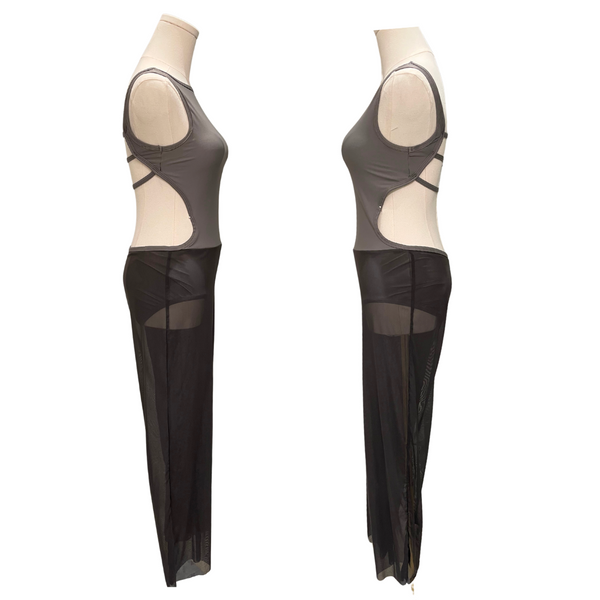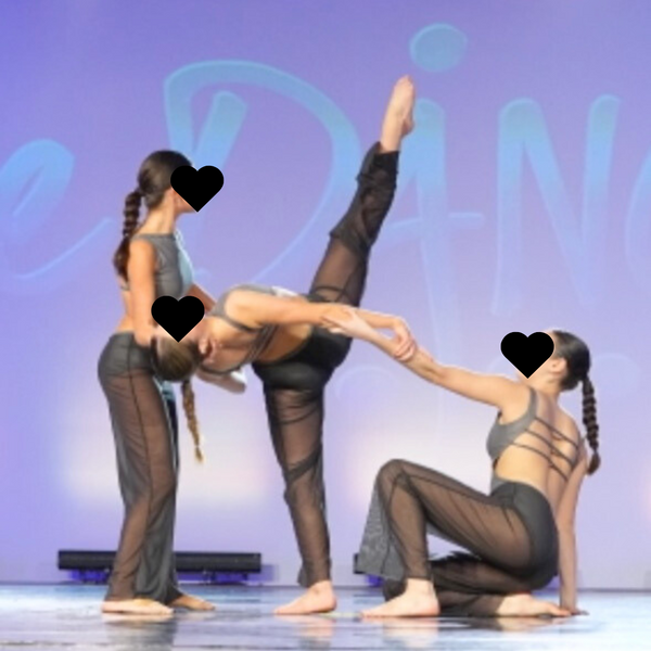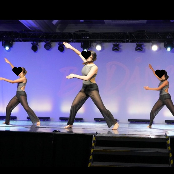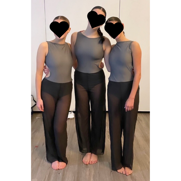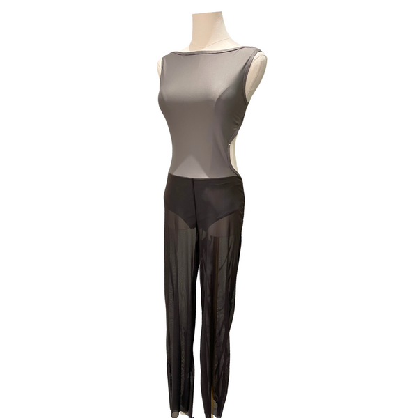 Custom costume by On the Dance Floor (OTDF): Grey with black mesh pants unitard and straps at the back.