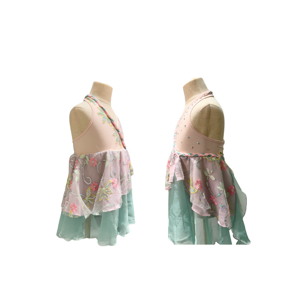 Custom made by Ashley Berry, this soft and sweet pastel lyrical dress is perfect for younger dancers. The blush pink bodice is embellished with rhinestones and features a braided halter neckline. A layered skirt with mint and pink floral embroidery floats beautifully with movement, making it a charming choice for lyrical or ballet solos. Comes with matching briefs.