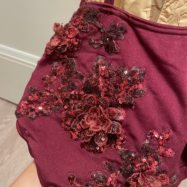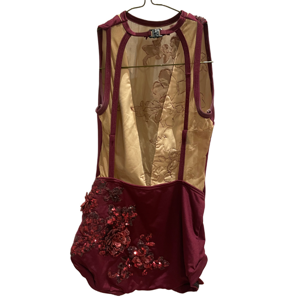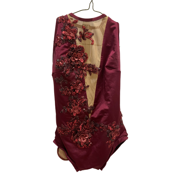 Custom made maroon bodysuit with beautiful appliqué work down the torso. Beige mesh insert down the front and has an open back.