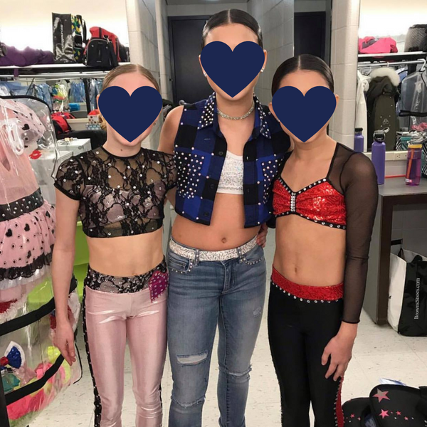 Adorable tap dance costume. White bra top, cropped blue and black plaid shirt, and jeans.