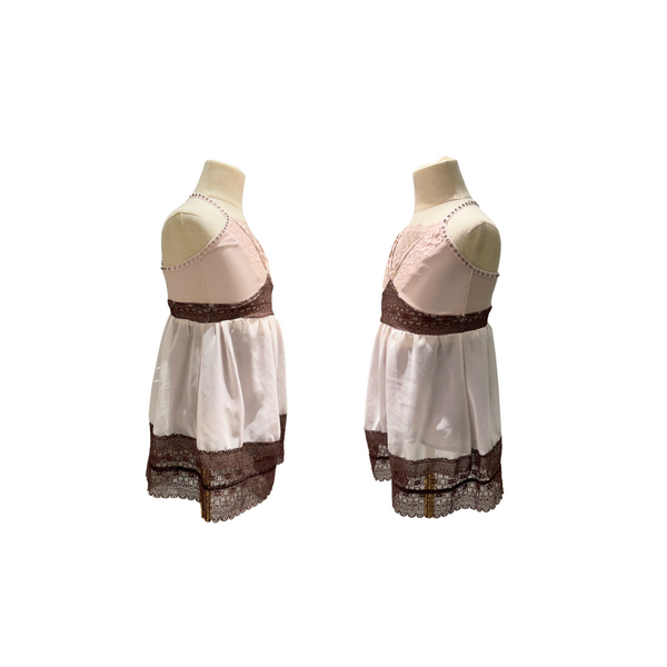 Custom made by Ashley Berry, this blush pink and chocolate brown mini dress is a sweet option for mini lyrical or storytelling solos. The soft pink bodice features lace detailing and a halter-style neckline, with criss-cross straps in the back for added support. A brown lace waistband provides contrast and structure, while the lightweight skirt has a soft sheen and is trimmed with matching brown lace. Designed for movement, this piece works well for young dancers in soft, expressive routines. Comes with matching briefs.