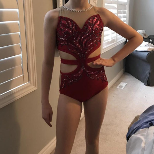 Custom made Effie Mathews Bodysuit. Stunning on Stage. Red Leo with mesh panels, handprinted super sparkly, tones of stones.