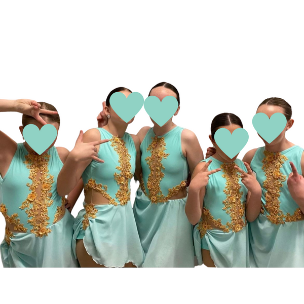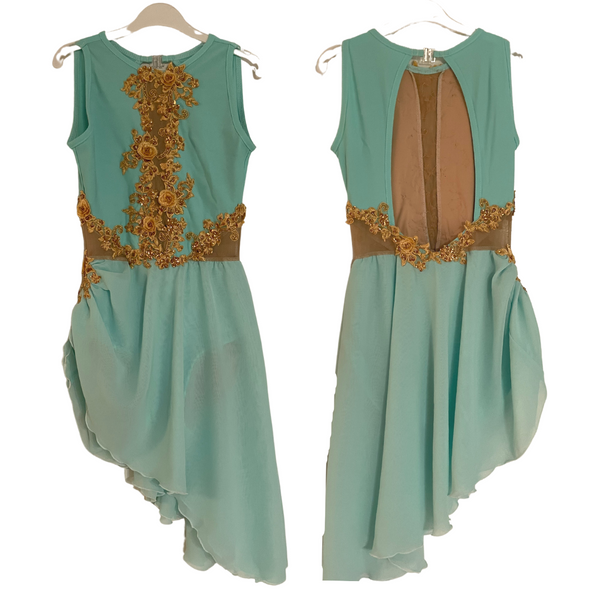 Custom made, aqua bright blue lyrical dress with gold appliqué work and beige mesh inserts.