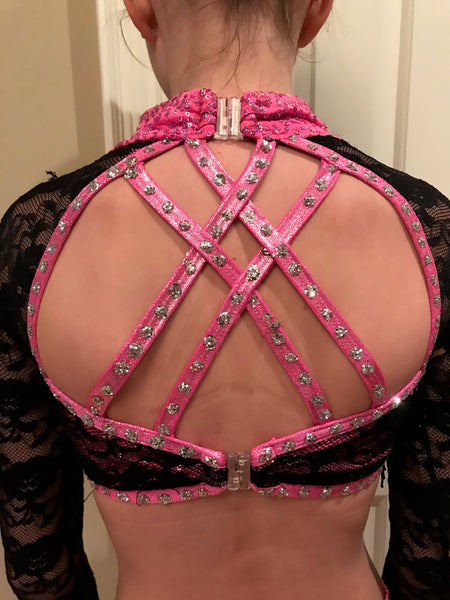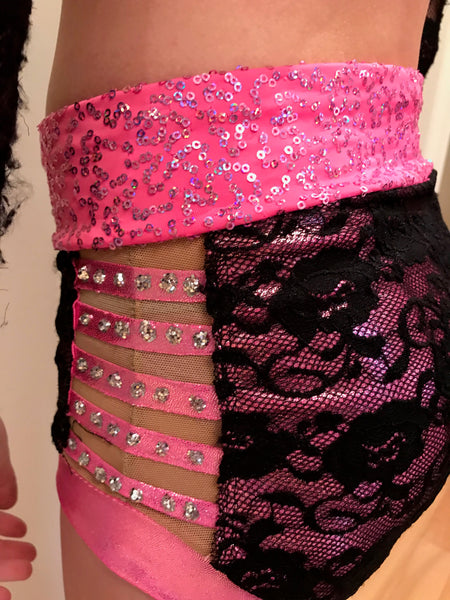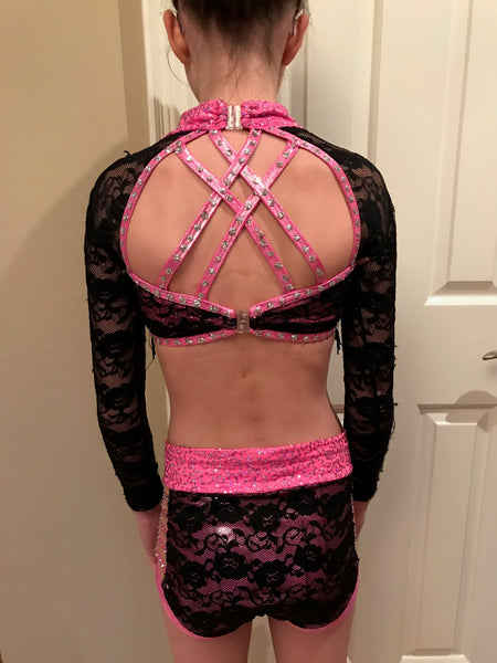 Custom made, pink and black lace two-piece costume: Long-sleeve crop top with beaded detailing along the bottom and criss-cross backing, and matching briefs.