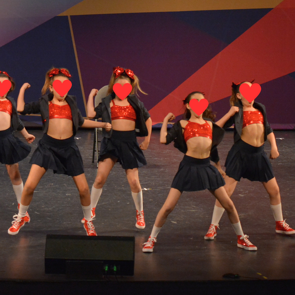 School girl black pleated skirt with matching blazer with red sequins lining the pockets, and matching red sequinned bra top.