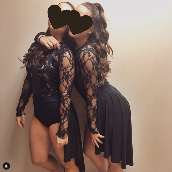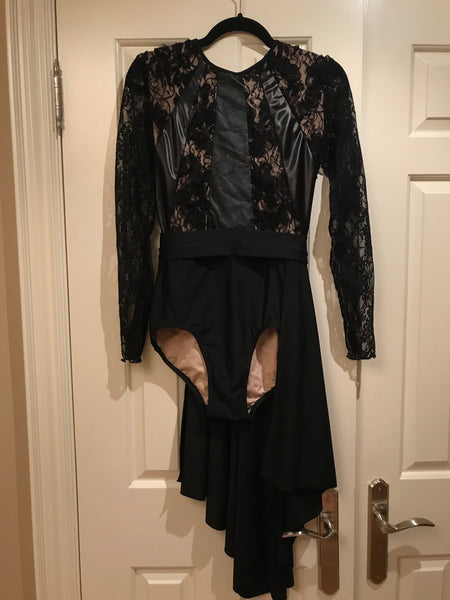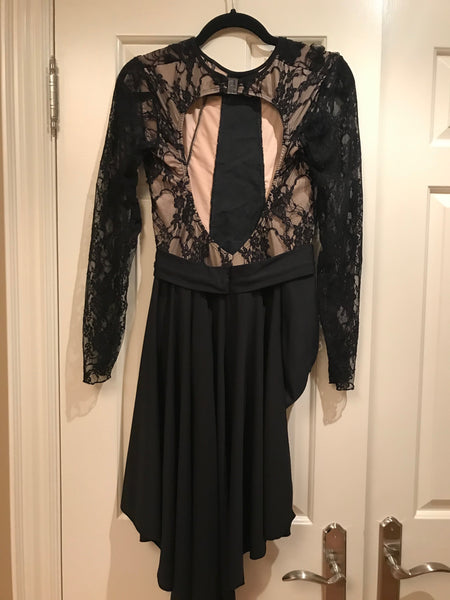 Custom made, long-sleeve black lace dress with lace and pleather detailing, and beige underlining. Amazing condition.