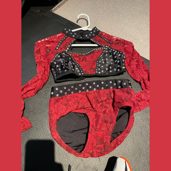 Custom made, matching top and briefs: Top has red lace long sleeves, with keyhole cutout and rhinestones. Comes with matching black and red lace briefs.