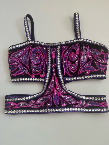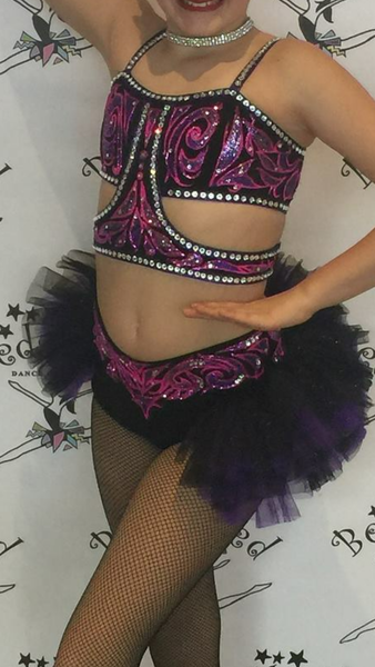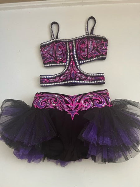 Custom made Effie Mathews 2 piece. Black base with beautiful pink and purple paint with tonnes of stones. Costume comes with top and matching bottoms featured in photos.